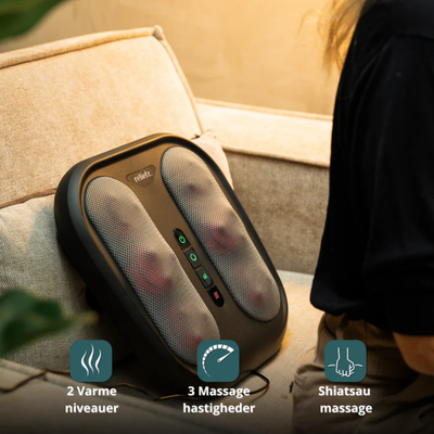 Vellafit Fodmassager Pro kombinerer shiatsu-massage, varme og luftkompression for at give en dybdegående behandling af både fødder og lægge. Shiatsu stimulerer fodens trykpunkter og løsner spændinger, luftkompressionen øger blodcirkulationen og giver en behagelig følelse af tryk, mens varmen hjælper med at reducere stivhed og fremmer afslapning. Resultatet er hurtig lindring af ømhed og muskeltræthed – perfekt efter arbejde, træning eller en lang dag på benene.